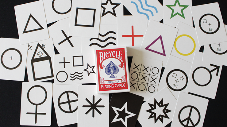 The SPECIAL ESP deck is an assortment of poker cards including 25 standard ESP cards and 31 gaff cards printed on the most popular cards in the world of magic: Bicycle Rider back.