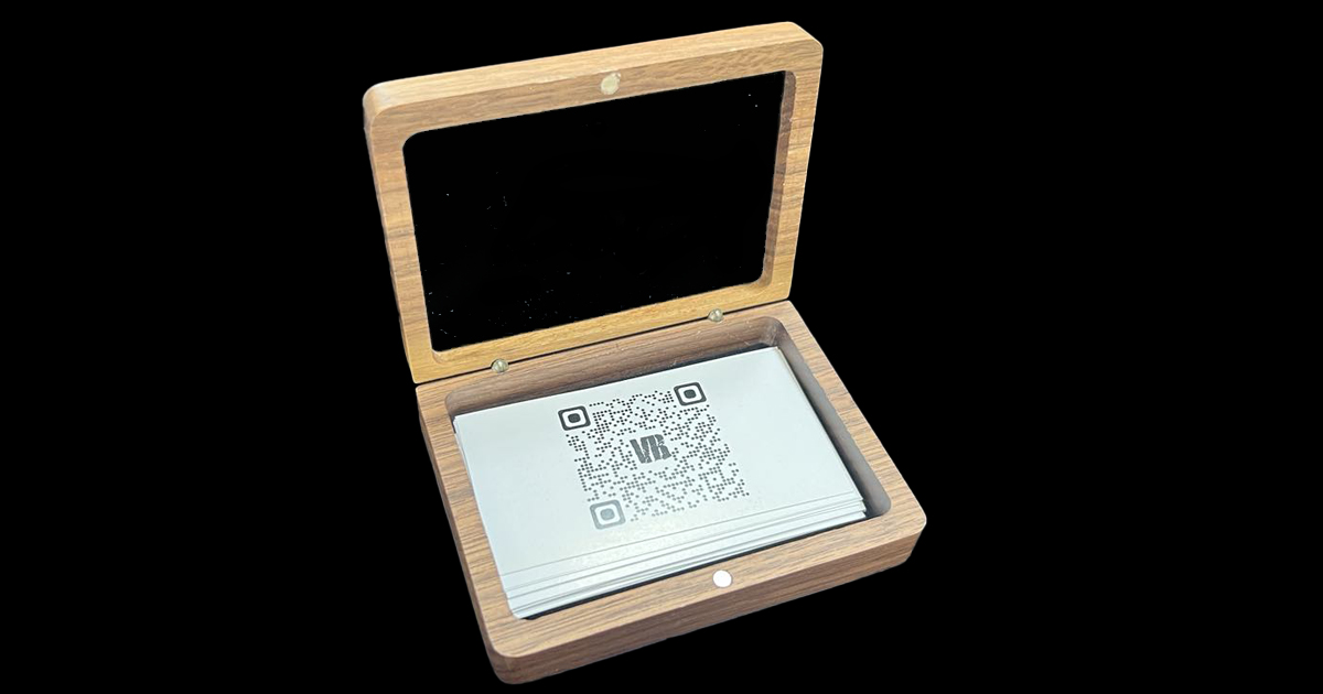 A blank business card is passed through your empty hand and emerges printed. The box it came from, once empty, now holds a full stack. Elegant walnut construction. A signature piece of magical branding.