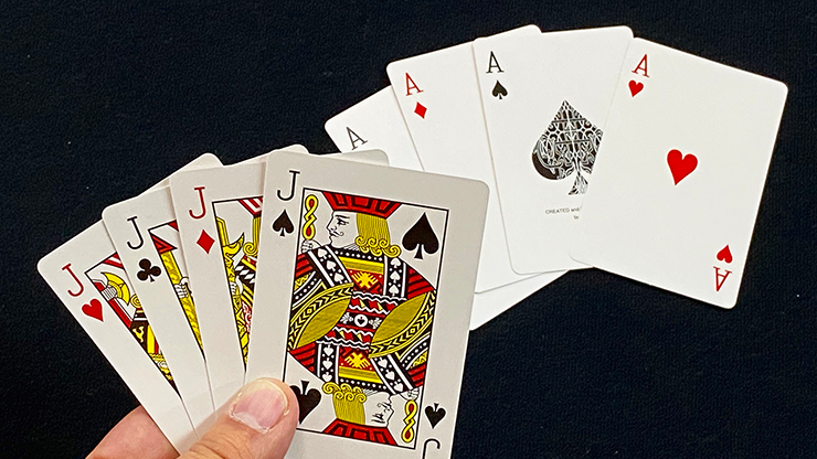 The magician holds four aces in his hand, and shows four jacks on the table. The charismatic Jack of Hearts is placed face down on top of the four faceup aces. The magician commands: “Atten-tion!” Amazingly, all of the aces turn face down in response to the jack’s power. Another command: “Round’em up!” Suddenly all the aces in the magician’s hand transform into the jacks. The aces are now found on the table.