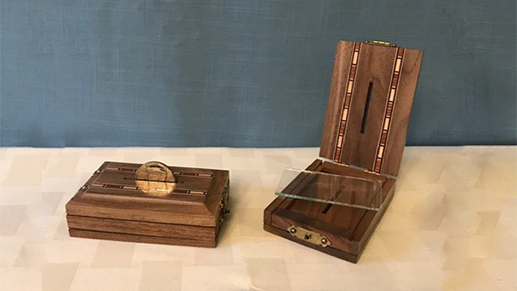 The Karpinski’s Coin Penetration is a decorative box that holds a piece of glass. A coin is placed into a hole on top of the box and, upon your command, passes through the piece of glass and falls through the bottom.