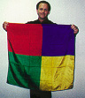The magician shows the audience five silks. One is red, one is yellow, one is green, one is blue and one is white. The white silk is tied around the others. This white silk is untied, and set aside. The other four silks are then held between the magician’s hands. He twirls his hands for a moment. Suddenly, instead of four individual silks, he only has one big 36″ square silk scarf in his hands! It is composed of four colors: red, yellow, green, and blue. **The four scarves have “blended” into one!**